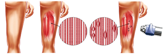 Trigger points are the principal cause of pain in the back, neck, shoulder and limbs. They are associated with palpable nodules in taut bands of muscle fibers and have extremely contracted sarcomeres. The dysfunctional sarcomeres contract so tightly that they begin to cut off their own blood supply. This causes the build-up of waste products which in turn irritates the sensory nerve endings which then causes yet more contraction. This vicious cycle is referred to as a “metabolic crisis”. Although the precise medical effects of acoustic wave therapy are still unclear, it can be assumed that the delivered acoustic energy unblocks the “calcium pump”. Thus, it reverses the metabolic crisis in the myofilaments and releases these trigger points